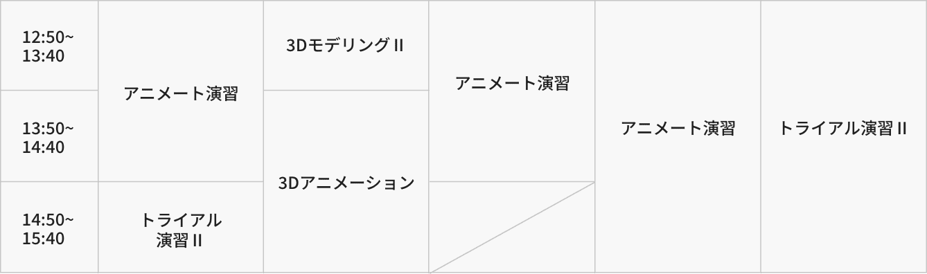 実習中心で3DCGデザイン知識とツールを修得。キャラクター、背景、アニメーション制作を通して幅広い分野を伸ばし、幅広い業界で活躍できるクリエイターへ!