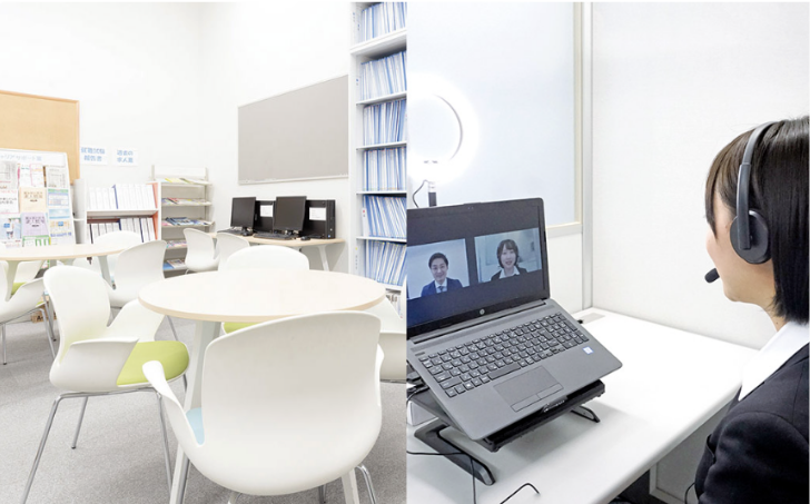 求人票や就職に関する資料を閲覧できるキャリアサポート室には、ネット環境や音響、照明などを整えたオンライン面接専用ブースも設置しています。