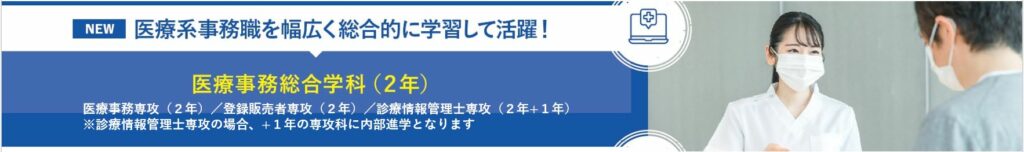 | 医療福祉事務学科 医療情報マネジメント学科 | ▶ | NEW ◎医療事務総合学科(2年課程)に統合! ※+1年の専攻科に内部進学することで診療情報管理士資格も取得可能! |